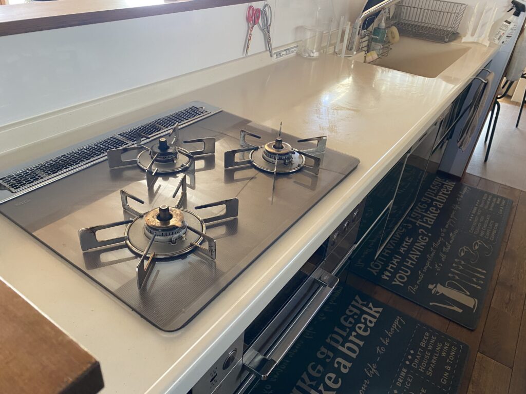 キッチンでは、換気扇を分解して水洗いし、油っぽい部分を丁寧に拭き上げ。シンクはクレンザーで磨いて、キッチンパネルやガスコンロも全体的に拭きました。