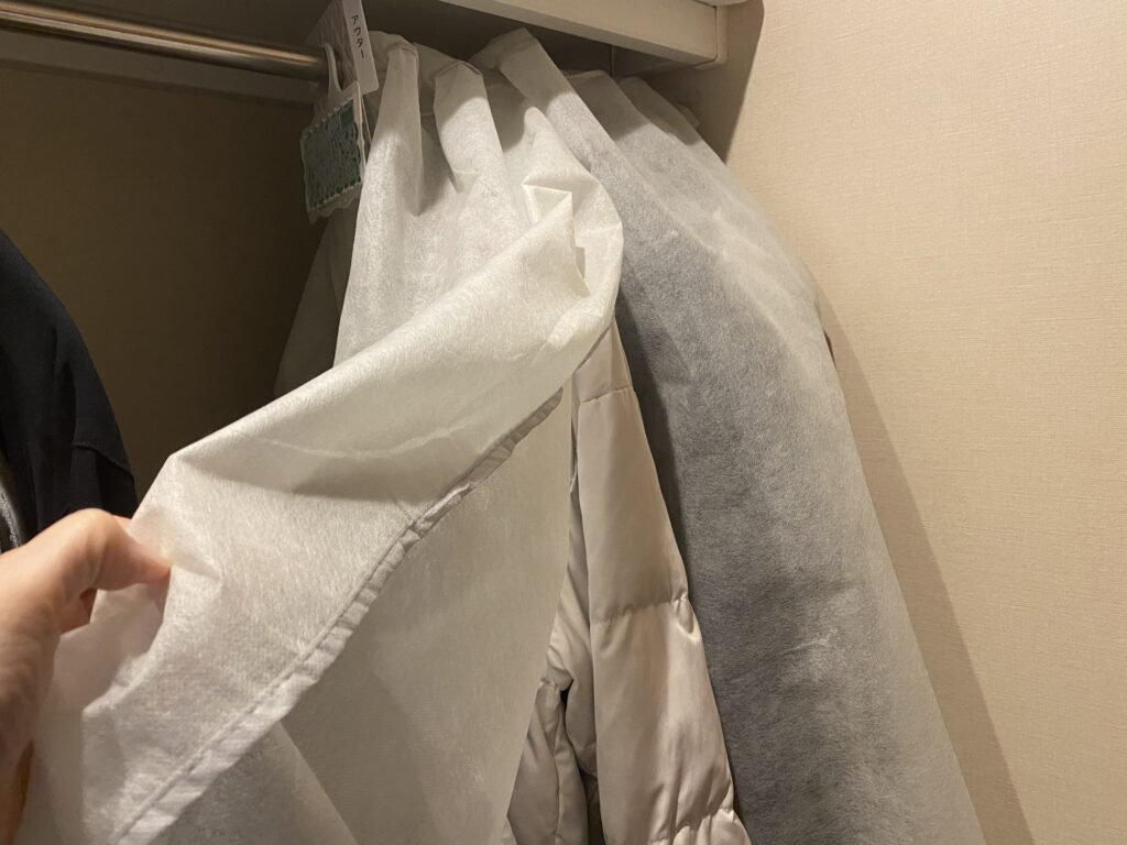 ハンガーポールの端(奥)には、冠婚葬祭用やアウターなど“しょっちゅう着ない服”をまとめて、カバーをかけて収納しています。