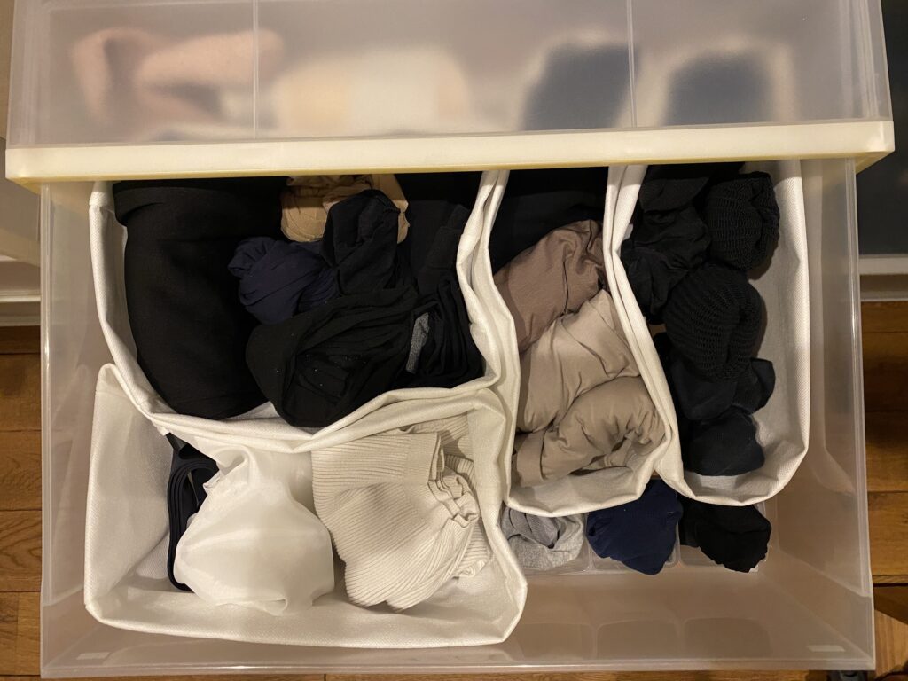 一番上の肌着・靴下の引き出しは、ここでもオンシーズンとオフシーズンを分けていて、不織布の仕切りを使って手前と奥で入れ替えしています。